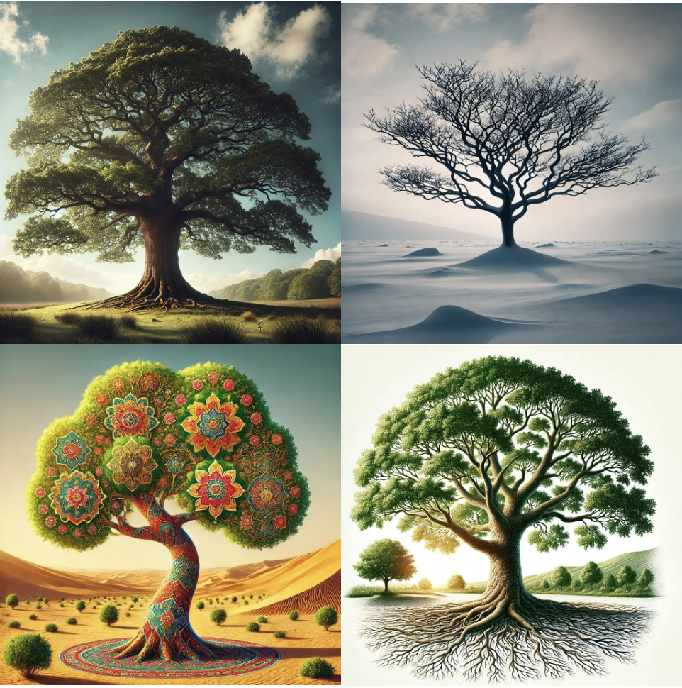 Now imagine how you might prompt an LLM like ChatGPT to give you a picture of your tree. When Stanford computer science PhD candidate Nava Haghighi, the lead author of the new study, asked ChatGPT to make her a picture of a tree, ChatGPT returned a solitary trunk with sprawling branches – not the image of a tree with roots she envisioned. Then she tried asking, “I’m from Iran, make me a picture of a tree,” but the result was a tree designed with stereotypical Iranian patterns, set in a desert – still no roots. Only when she prompted “everything in the world is connected, make me a picture of a tree” did she see roots.