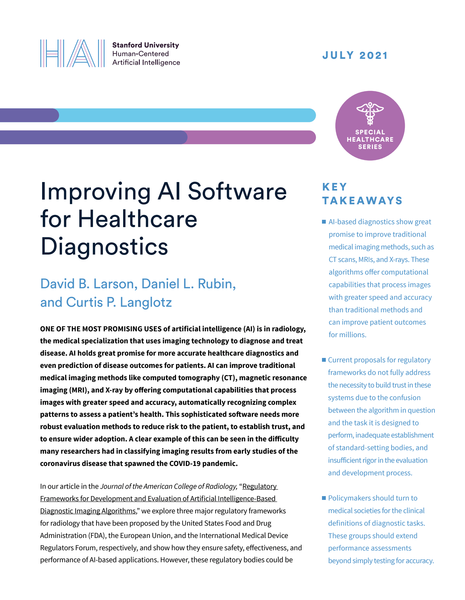 Langlotz is Professor of Radiology, Medicine, and Biomedical Data Science and Senior Associate Vice Provost for Research at Stanford University. His laboratory investigates the use of deep neural networks and other machine learning technologies to detect disease and eliminate diagnostic errors through analysis of medical images and clinical notes. He is a Senior Fellow at the Stanford Institute for Human-Centered Artificial Intelligence and Director of the Center for Artificial Intelligence in Medicine and Imaging (AIMI Center), which supports over 150 Stanford faculty conducting interdisciplinary artificial intelligence research that optimizes how clinical data are used to promote health.