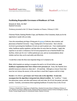Michelle Mello is Professor of Law at Stanford Law School and Professor of Health Policy in the Department of Health Policy at Stanford University School of Medicine. She conducts empirical research into issues at the intersection of law, ethics, and health policy. She is the author of more than 250 articles on medical liability, public health law, the public health response to COVID-19, pharmaceuticals and vaccines, data ethics and privacy, research ethics and governance, artificial intelligence, and other topics.