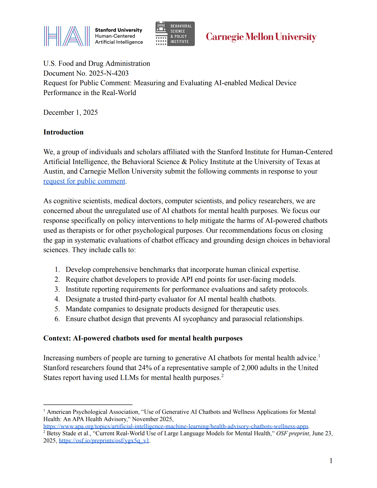 Stanford scholars respond to a federal RFC on evaluating AI-enabled medical devices, recommending policy interventions to help mitigate the harms of AI-powered chatbots used as therapists.