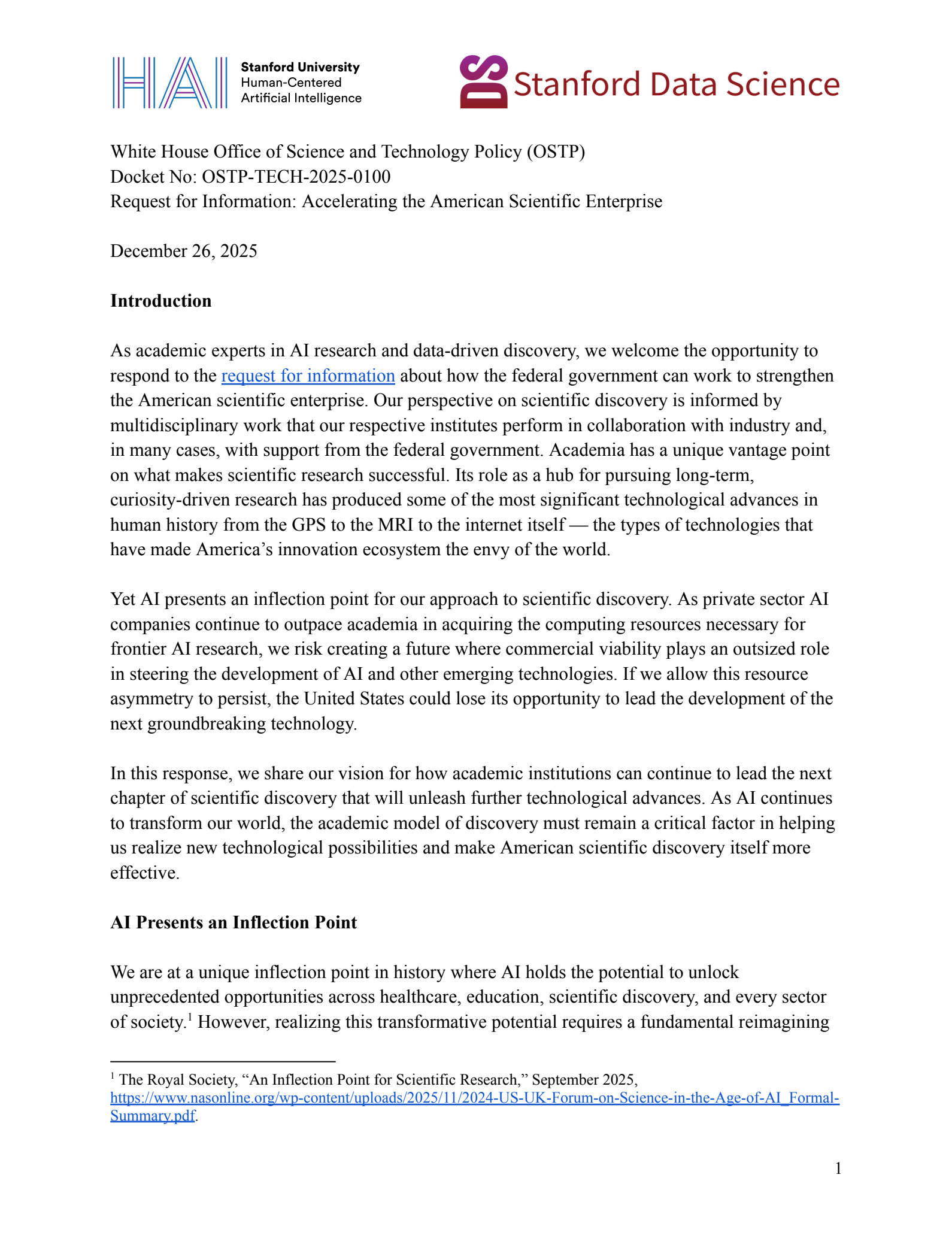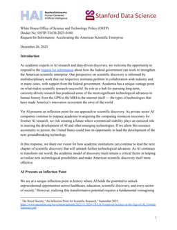Stanford scholars respond to a federal RFI on scientific discovery, calling for the government to support a new “team science” academic research model for AI-enabled discovery.