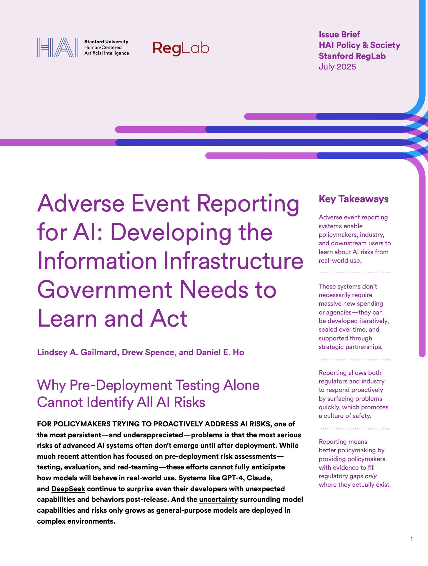 This brief assesses the benefits of and provides policy recommendations for adverse event reporting systems for AI that report failures and harms post deployment.