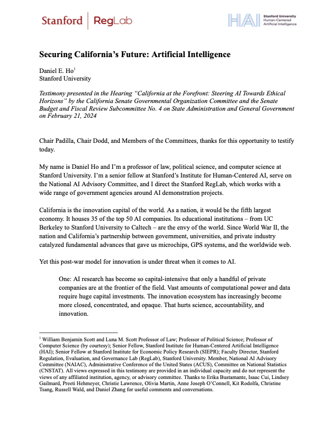 In this testimony presented in the California Senate Hearing “California at the Forefront: Steering AI Towards Ethical Horizons,” Daniel E. Ho offers three recommendations for how California should lead the nation in responsible AI innovation by nurturing and attracting technical talent into public service, democratizing access to computing and data resources, and addressing the information asymmetry about AI risks.