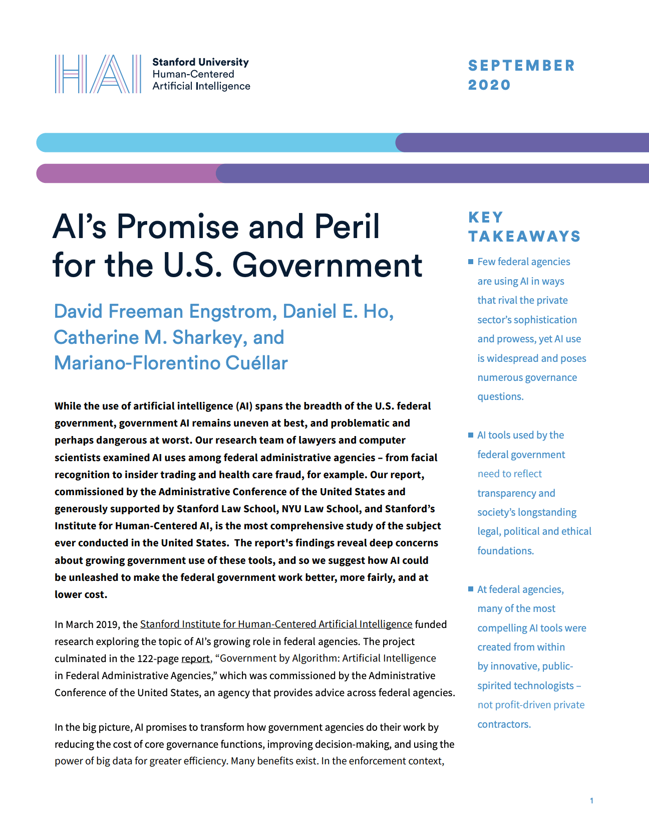 In March 2019, the Stanford Institute for Human-Centered Artificial Intelligence funded research exploring the topic of AI’s growing role in federal agencies. The project culminated in the 122-page report, “Government by Algorithm: Artificial Intelligence in Federal Administrative Agencies,” which was commissioned by the Administrative Conference of the United States, an agency that provides advice across federal agencies.