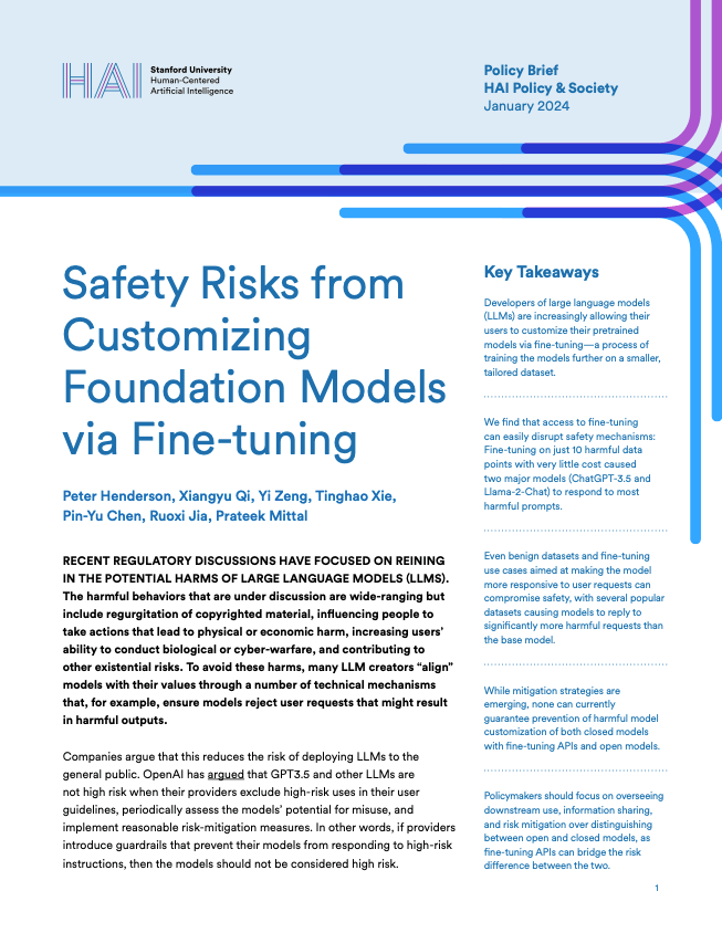 In our recent paper, “Fine-Tuning Aligned Language Models Compromises Safety, Even When Users Do Not Intend To!”—a collaboration between researchers at Stanford University, Princeton University, Virginia Tech, and IBM—we examine the safety costs associated with such custom fine-tuning. We found that it takes just 10 training data points (and less than $0.20) to compromise the safety guardrails for OpenAI’s GPT3.5 turbo via the publicly available fine-tuning API. The resulting fine-tuned models affirmatively respond to a wide range of harmful requests, including requests to write malware and hate speech. We also found that fine-tuning on completely benign, and commonly used, datasets also compromises safety to some extent. This means that customers may unintentionally compromise the safety of the initial model just by using the fine-tuning API for customization.