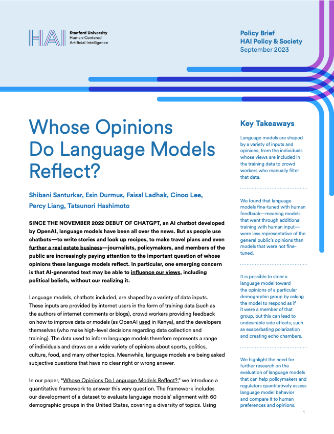 In our paper, "Whose Opinions Do Language Models Reflect?," we introduce a quantitative framework to answer this very question. The framework includes our development of a dataset to evaluate language models' alignment with 60 demographic groups in the United States, covering a diversity of topics. Using this framework, we find a major gap between the responses provided by language models and the views of demographic groups in the United States. We also discover a number of U.S. groups whose views are poorly reflected by current language models, such as people 65 years of age and older, widowed individuals, and people who regularly attend religious services. Our framework allows policymakers to quantitatively evaluate language models and serves as a reminder that issues of representation in language models should remain front of mind.