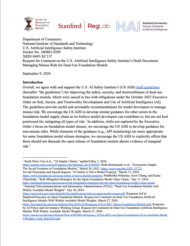 In this response to the U.S. AI Safety Institute’s (US AISI) request for comment on its draft guidelines for managing the misuse risk for dual-use foundation models, scholars from Stanford HAI, the Center for Research on Foundation Models (CRFM), and the Regulation, Evaluation, and Governance Lab (RegLab) urge the US AISI to strengthen its guidance on reproducible evaluations and third- party evaluations, as well as clarify guidance on post-deployment monitoring. They also encourage the institute to develop similar guidance for other actors in the foundation model supply chain and for non-misuse risks, while ensuring the continued open release of foundation models absent evidence of marginal risk.