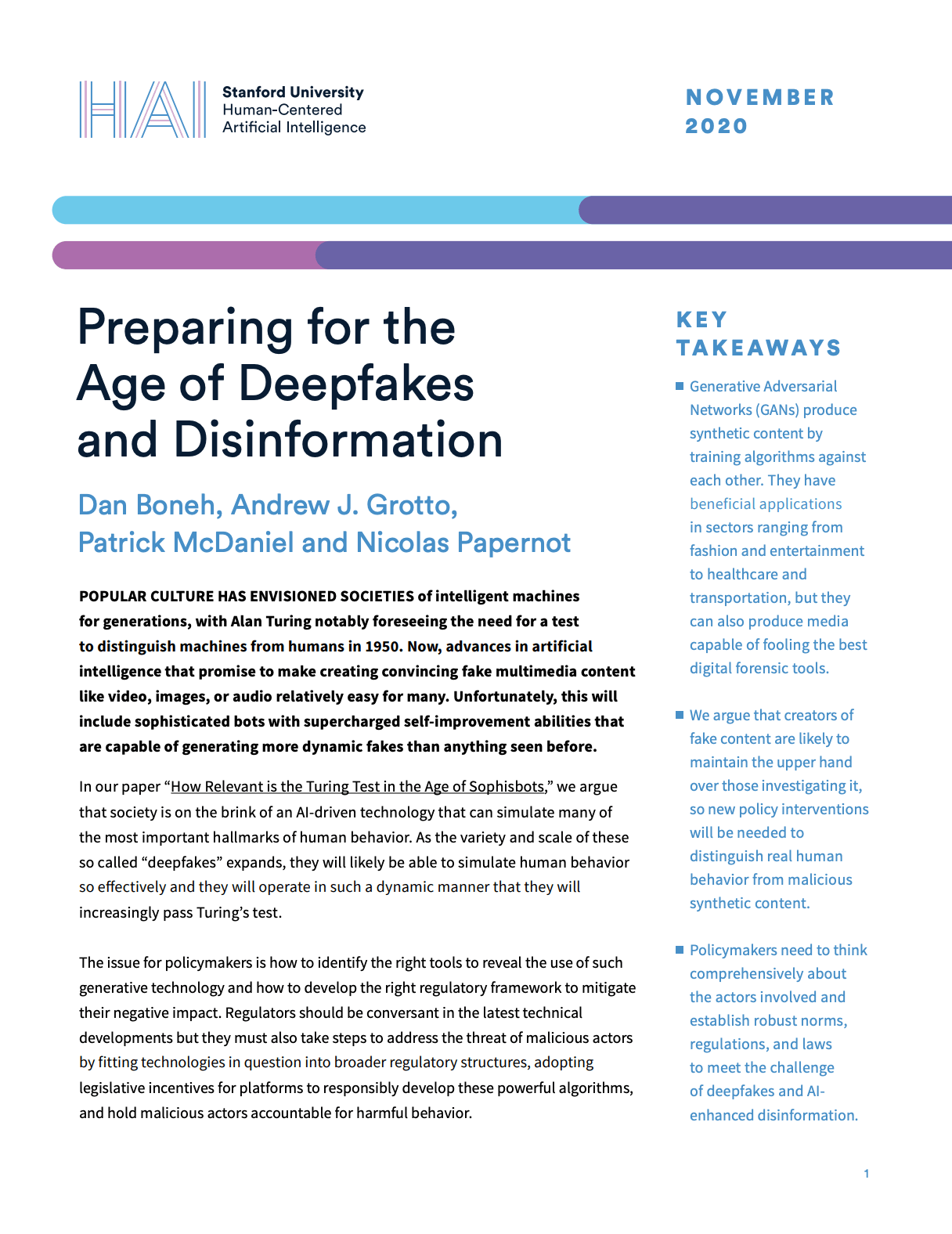This brief warns of the dangers of generative adversarial networks that can make realistic deepfakes, calling for comprehensive norms, regulations, and laws to counter AI-driven disinformation.