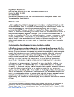 Stanford scholars respond to a federal RFC on dual use foundation models with widely available model weights, urging policymakers to consider their marginal risks.