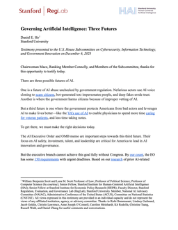 In this testimony presented to the U.S. House Subcommittee on Cybersecurity, Information Technology, and Government Innovation, Daniel E. Ho recommends six AI governance actions including boosting AI talent, establishing a mandated adverse event reporting system, and funding public AI research initiatives.
