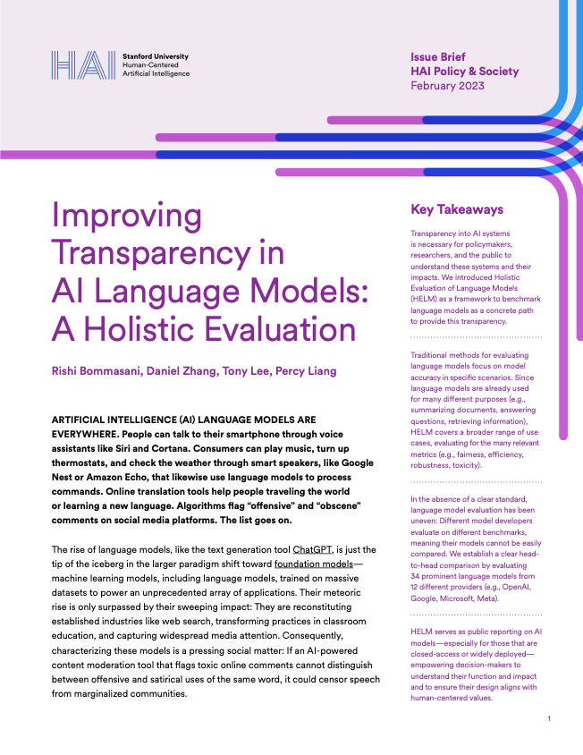 This brief introduces Holistic Evaluation of Language Models (HELM) as a framework to evaluate commercial application of AI use cases.