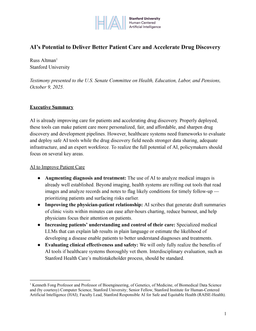 In this testimony presented to the U.S. Senate Committee on Health, Education, Labor, and Pensions hearing titled “AI’s Potential to Support Patients, Workers, Children, and Families,” Russ Altman highlights opportunities for congressional support to make AI applications for patient care and drug discovery stronger, safer, and human-centered.